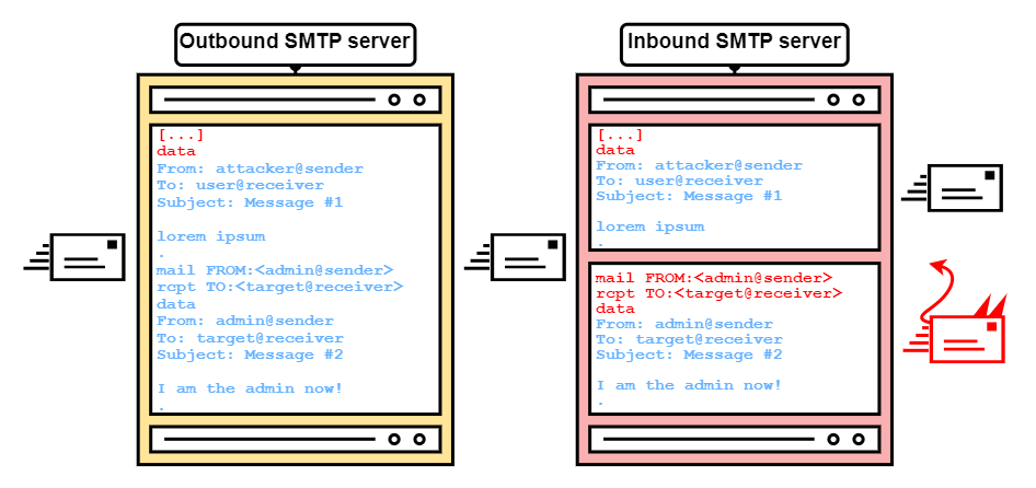 SMTP smuggling is a novel vulnerability that allows e-mail spoofing by exploiting interpretation differences of the SMTP protocol in vulnerable server constellations. More specifically, different understandings of so called "end-of-data" sequences between outbound (sending) and inbound (receiving) SMTP servers may allow an attacker to smuggle - hence SMTP smuggling - spoofed e-mails (see Figure 1). Threat actors can abuse this to send malicious e-mails from arbitrary e-mail addresses, allowing targeted phishing attacks.